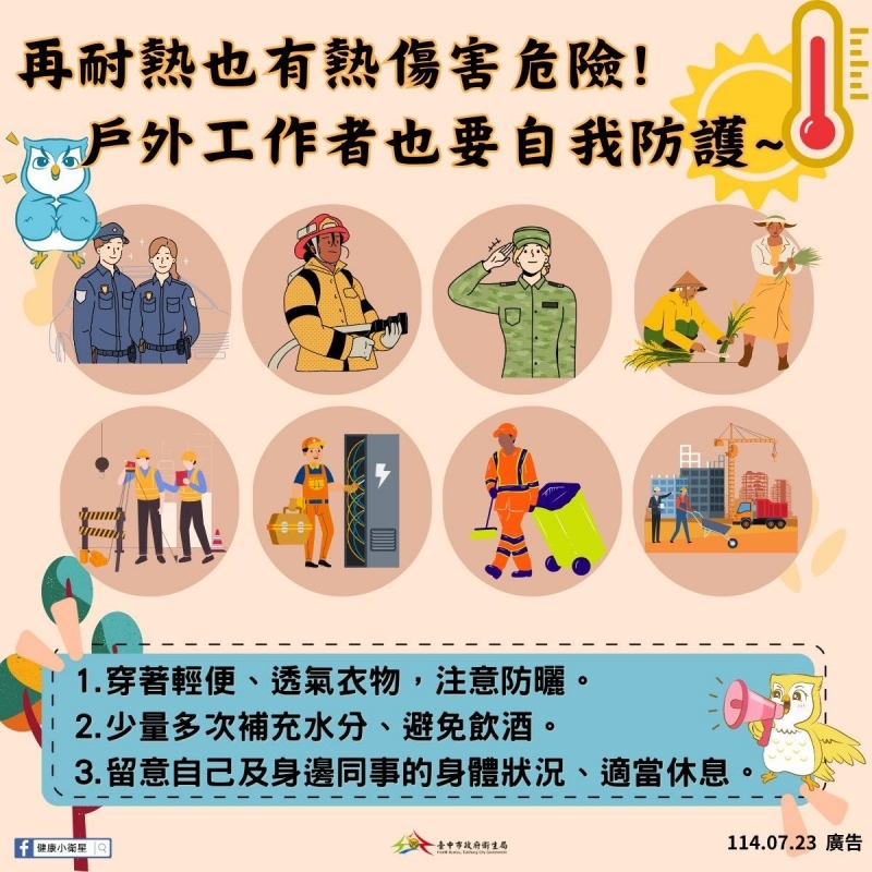 建議避免非必要的戶外活動、勞動及運動,注意防曬、多補充水份,但是戶外工作者因工作關係,經常得在豔陽下工作、活動,再加上濕氣高,排汗散熱的效果降低,如果沒有適時作好防護措施,都可能發生中暑、熱衰竭。